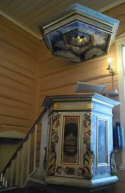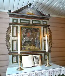 The earliest existing historical records of the church date back to the year 1398, but the church was not built that year. The first church at Hvarnes was a wooden stave church that was likely built around the year 1200. In 1398, the stave church was dedicated to St. Olav. By the late 1600s, the church was said to be showing signs of rot and decay. In 1671, the church building was purchased by the Countship of Larvik, but the building was not improved. Around 1700, it was decided to tear down the old church and rebuild it on the same site. The new church was completed in 1705. The new long church was built of log construction and it has a rectangular nave and a rectangular chancel. In 1708, the church received exterior paneled siding. It also got more beams and iron bolts to improve its structural integrity. It is uncertain if the wooden tower was part of the original construction, but by 1713, there was a wooden tower at the main entrance on the west end of the nave. In 1849, a small sacristy on the south side of the chancel was built (and it was enlarged in 1896). The church was painted maroon on the outside until 1872, but was then painted white. At the same time, the interior was repainted. Then there were further interior changes in 1928–29 before a major restoration in 1977 which saw the interior colors changed back to the original. Inside, the church has a second floor seating gallery along the west wall and north wall of the nave. The chancel opening is round-arched, and the chancel and nave both have a flat ceiling, with the chancel ceiling being significantly lower than that of the nave.[3][4]