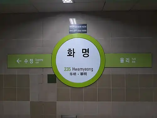 Hwamyeong Station (Korean: 화명역; Hanja: 華明驛) is a station on the Busan Metro Line 2 in Hwamyeong-dong, Buk District, in the northwestern part of Busan, South Korea. It was one of the first stations opened on the line in 1999.[1]