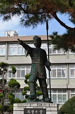 It is conjectured that the foundation of the Hwarang system originated from the mid 6th century during the King Jinheung of Silla era, but the exact date of establishment is ambiguous: Samguk sagi reports the year of 576 AD, Tongguk t'onggam reports the year of 540 AD, and Sadaham is already recorded as a Hwarang in 562 AD according to Samguk sagi yeoljeon.[8] Although some historians believe that the Hwarang played a big part in the unification of the Three Kingdoms, some historians are unclear about the role that the Hwarang played in the unification.[9] According to the Samguk yusa, the Silla king, "concerned about the strengthening of the country ... again issued a decree and chose boys from good families who were of good morals and renamed them hwarang."[10] The actual word used in this chronicle is hwanang (花娘), meaning "flower girls".[11] This suggests that the Hwarang were not originally military in character, as the Wonhwa were not soldiers.