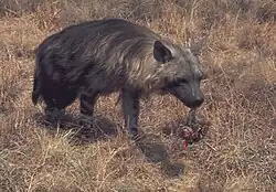 The brown hyena (Parahyaena brunnea), also called the strandwolf,[4] is a species of hyena found in Namibia, Botswana, western and southern Zimbabwe,[5] southern Mozambique, western Eswatini, and South Africa.[6] It is the only extant species in the genus Parahyaena. It is currently the rarest species of hyena.[7] The largest remaining brown hyena population is located in the southern Kalahari Desert and coastal areas in Southwest Africa.[8] The global population of brown hyena is estimated by IUCN at a number between 4,000 and 10,000 and its conservation status is marked as near threatened in the IUCN Red List.[1]