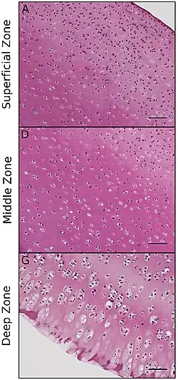 The articular cartilage extracellular matrix has a highly specialized architecture that is zonally organized: the superficial zone consists mostly of type II collagen fibers aligned parallel to the articular surface to resist shear forces, whereas the deep zone consists of the same fibers aligned perpendicularly to the bone interface to absorb compressive loads.[5]