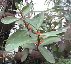 This epiphyte grows a tuber also known as a caudex, that is spineless and contains chambers; many of which are connected to one another. These tubers may grow 10–55 cm in diameter with two to four stems that reach about 60 cm long. The leaves, which grow 4–15 cm long and 2–7 cm wide, are opposite, elliptical and have a leathery texture. Flowers are four-merous, white, and occur in groups of 3–10, which then yield orange, fleshy fruits 6–7 mm in diameter