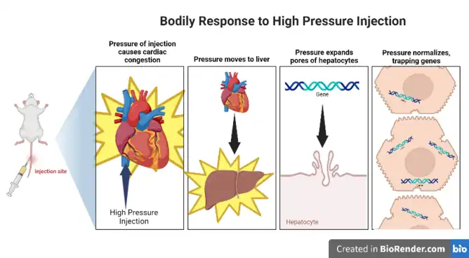 Hydrodynamic Delivery was developed as a way to insert genes without viral infection (transfection). The procedure requires a high-volume DNA solution to be inserted into the veins of the rodent using a high-pressure needle.[2] The volume of the DNA is typically 8-10% equal to 8-10% of the animal's body weight, and is injected within 5-7 seconds.[3][4] The pressure of the insertion leads to cardiac congestion (increased pressure in the heart), allowing the DNA solution to flow through the bloodstream and accumulate in the liver.[2] The pressure expands the pores in the cell membrane, forcing the DNA molecules into the parenchyma, or the functional cells of the organ.[1][5][2][4] In the liver, these cells are the hepatocytes. In less than two minutes after the injection, the pressure returns to natural levels, and the pores shrink back, trapping the DNA inside of the cell. After injection, the majority of genes are expressed in the liver of the animal over a long period of time.[6][3]