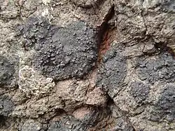 The pseudocortex, a layer beneath the surface of the thallus, contains brown pigment, contributing to the lichen's dark appearance. Perithecia, the reproductive structures of the lichen, project from the thallus surface. They typically measure 220 to 360 μm in diameter, and often have a distinct flat top. The sides may be uneven or have protrusions (bosses). The ostiole, or opening, of the perithecia may be visible as a small pit.[7]