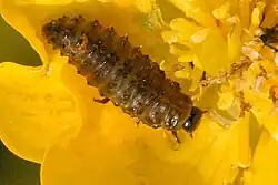 Hydrothassa marginella is a common and widespread species, active between the months of mid-April and August.[1] It has various host plants, especially buttercups.[2] Adults overwinter in grass tussocks.[1]