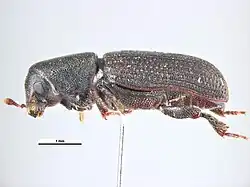 This beetle is cylindrical in shape and 3.5 to 5.5 millimeters long by about 1.4 millimeters wide. It is dark gray or shiny black with reddish antennae and legs. The newly hatched beetle is entirely reddish, and its color darkens over time. The elytra, the front of the face, and most of the prothorax are punctate. The head is bent downward, so just a small part is visible from above. The rostrum is short, not elongated into a typical weevil snout. The whitish egg is less than one millimeter long, and the larva is c-shaped, legless, and white with an amber-colored head capsule. The pupa is "mummy-like",[1] yellowish-white, and spiny.[2]