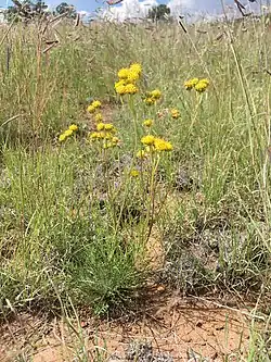 Hymenopappus mexicanus is a biennial herb up to 90 cm (3 feet) tall. One plant produces 1-20 flower heads per stem, each head with 20-40 yellow disc flowers but no ray flowers.[4]