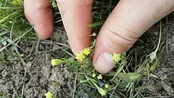 Hymenoxys texana is an annual herb with delicate reddish or purplish stems growing only 10 or 15 centimeters (4-6 inches) tall. The leaves have rubbery, glandular blades which may be simple or divided into lobes, particularly at mid-stem. The inflorescence is a solitary flower head or an open cluster of several heads. Each head is under a centimeter wide and has 6 to 8 yellow ray florets each 2 or 3 millimeters long.[3] The ray florets are often tucked behind the phyllaries. The center of the head has 30–75 tiny disc florets.[4]