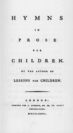 - Hymns in Prose for Children by Mrs. (Anna Letitia) Barbauld. London: J. Johnson, No. 72, St. Paul's Church-Yard, 1781 at A Celebration of Women Writers