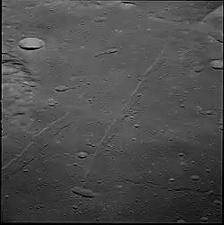 About 70 kilometers to the north of Hypatia is a system of linear rilles designated Rimae Hypatia, running about 180 kilometers across the Mare Tranquillitatis, and generally following a course to the south-southeast. The part of the rilles close to the crater Moltke was informally called U.S. Highway 1 by the Apollo 10 and Apollo 11 crews.