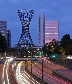 In 1960 there were the first thoughts to centralize the headquarters of Hypobank, which was located to twelve different locations at that time. In 1970, concrete planning for the construction of the hypo-house at the Arabellapark started in cooperation with the architectural firm Betz. The construction preparations began in September 1974 with the excavation. For the low-rise buildings and the pillars of the tower, construction work began in April 1975. In November 1978, the new offices were occupied in the low-rise buildings. The skyscraper was completed in 1981[1] and opened officially on 16 November 1981. Today it is part of the administrative center of HypoVereinsbank at the Arabella Park. The ensemble also includes two low-rise buildings (North and South) and the later built "Hypo-House East".The building is located at the Richard-Strauss-Straße, corner Denninger Straße, right on the arterial road "Mittlerer Ring" (district Bogenhausen, subway station Richard-Strauss-Straße on line U4). It is 113.7 meters (374 feet) high and was designed and planned by architect couple Walther and Bea Betz. The static calculations were very complicated due to the unusual architecture and included 100,000 pages. The builder-owner was "Hypo-Bank Verwaltungszentrum GmbH & Co. KG", Held & Francke Bauaktiengesellschaft were the general contractor. HVB Tower was the first building in Munich with a height of about 100 meters (328 feet).The complex consists of a tower with 27 floors above ground, four underground floors and two low-rise buildings associated with the tower. The net floor area (NFA) is 100,000 m² (1,076,391 square feet) gross floor area of approximately 140,000 m² (1,506,947 square feet). As an architectural feature five floors are hanging in the Tower (5th-9th floor), which are suspended from a central support frame. Since 2006, the HVB Tower is a listed building. Until the completion of Uptown Munich in 2004, the 27-storey Hypo-Haus was Munich's tallest office building.