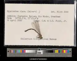 Hypolestes have three tagmata (distinct body segments) for their anatomy, which includes the head, thorax, and abdomen. Like dragonflies, they have compound eyes on either side of their head.[3] On their thorax, there are posterior forewings and anterior hindwings. Damselflies are weak fliers in comparison to dragonflies based on their wing and overall body structure.[4] All damselflies have segmented thoraxes and abdomens.[3] For reproduction structures, the male accessory genitalia located under the thorax on the second segment is called the genital ligula. The genital ligula branches off into four parts and is covered in spines for male-competition processes.[5] Shape and size of male genital ligula differ between all three of the species.[1] The primary female reproductive structure is an ovipositor, which is utilized post-copulation.[4] Both males and females have anal appendages located on the abdomen, However, the female anal appendages are not protruded compared to the male anal appendages.[4] In the Hypolestes species, forewings range from 23.6 to 25.8 millimeters in length, hindwings 22.6 to 25.0 millimeters, and the abdomen with anal appendages included are 28.5 to 20.2 millimeters.[1] The total length of the individual can be from 39.5 to 43.6 millimeters long. The color of Hypolestes is dependent on the sex. Males are described to be a light blue, whereas females are black with vertical yellow striping down the thorax. The stripe pattern in females is identical in H. hatuey and H. trinitatis, but differs in H. clara[1].