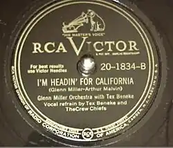 "I'm Headin' For California" is a 1944 song composed by Glenn Miller and Arthur Malvin and performed for radio broadcast. The song was released in 1946 as a 78 single by the Glenn Miller Orchestra led by Tex Beneke. The song was Glenn's last composition.
