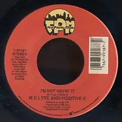 "I'm Not Havin' It" is a song by American rappers Positive K and MC Lyte. It was included on the 1988 compilation album The First Priority Music Family: Basement Flavor and released as a single the following year. The B-side "A Good Combination", by Positive K as a solo artist, is the main song in some versions of the single.[2][3]