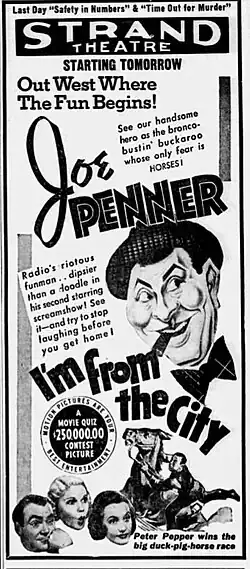 I'm from the City is a 1938 American Western film directed by Ben Holmes, who also wrote the original story that was adapted into a screenplay by Nicholas T. Barrows, Robert St. Clair and John Grey. William Sistrom produced the film for RKO Pictures, which also distributed the film. It premiered on August 5, 1938. The film stars Joe Penner, Richard Lane and Lorraine Krueger.