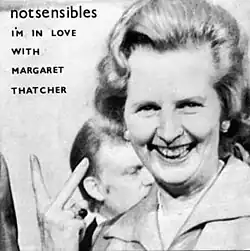 The Notsensibles formed in Burnley, Lancashire, in 1978, to "make silly records and play silly gigs".[4] Their second single, "I'm in Love with Margaret Thatcher", was issued in October 1979, five months after Thatcher's win in the UK General Election. Initially self-released in a pressing of 1,000 on the Redball label, but reissued on the Snotty Snail label due to continuing demand,[4] the release gave them a No. 8 UK Indie Chart hit at the start of 1980.[5] According to one review, the song was: "Meant as neither a pro- nor anti-Thatcher song. It revolved around the idea that no-one was too sacred to get the piss taken out of."[6] Writer Simon Reynolds stated that it "...taps into the side of punk all about not taking anything seriously..."[7] The record sleeve showed a photograph of Thatcher apparently giving a V sign to the camera.[8] The single's B-side included "Gary Bushell's Band of the Week", which poked fun at the journalist.[9]