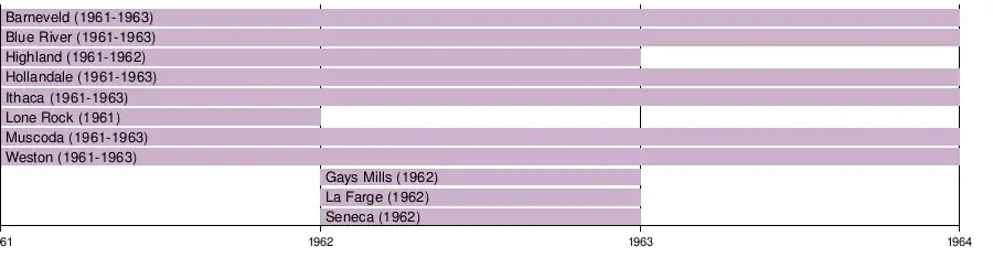 The I-W League, also known by its official name of the Iowa County-Wisconsin River League, was formed in 1960 from the merger of two previously established conferences: the Iowa County League (Barneveld, Highland, Hollandale and Ridgeway) and the Wisconsin River League (Blue River, Ithaca, Lone Rock, Muscoda and Weston).[1] These two conferences were losing members rapidly due to consolidation of rural school districts, and joined forces to continue interscholastic league competition. Ironically, the very same reason this league was created also contributed to its eventual demise. Basketball was the first sport sponsored by the new league, and eight-player football was sponsored for the first time in 1961 with all members participating except for Ridgeway (which did not sponsor football).[2] In 1962, the I-W League lost both Lone Rock and Ridgeway to consolidation.[3] Lone Rock merged with Arena and Spring Green to create the River Valley district,[4] and Ridgeway was folded into Dodgeville's school district. Additionally, three football members joined from the Kickapoo Valley League that fall: Gays Mills, La Farge and Seneca[5] Their time as football-only members was short-lived, as all three schools returned to the Kickapoo Valley League for the 1963 season.[6] The I-W League also lost two more members in 1963, as Highland and Weston left to join the Black Hawk League[7] and Scenic Central Conference,[8] respectively. Left with only five members, the conference continued for one more season before Muscoda left to join the Southwest Wisconsin Athletic League in 1964.[9] The I-W League ended operations in later that year when two of its members (Blue River and Ithaca) joined the Kickapoo Valley League.[10] The two remaining schools (Barneveld and Hollandale) competed as independents for a season before following their I-W League brethren into the Kickapoo Valley League for 1965.[11]