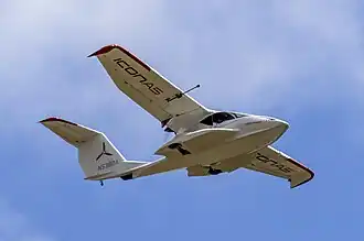 A prototype was constructed from 2007 to 2008, and made its first flight in July 2008. In January 2009, the company announced completion of the first phase (27 flights) of a three-phase testing program, including water handling. In February 2009, the prototype entered the second phase of testing to refine aerodynamic and handling qualities.[10] In 2011, an updated "spin-resistant" wing was flight tested, and finished in February 2012. The design meets FAR Part 23 type certified requirements by employing a cuffed wing with multiple proprietary airfoils which change along the wing's span.[11][12][13] Lotus Engineering replaced Designworks the same year to develop an "automotive style" aircraft interior and assist with the development of lightweight component manufacturing.[14]