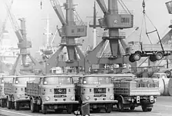 W 50 trucks from IWL on a quayside at Rostock in March 1982, being loaded onto a ship for export.