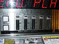 The beatmania IIDX cabinet has many standard features that are found in traditional arcade cabinets such as a widescreen display, powerful speakers, and start buttons. Also, unique to IIDX cabinets are the effector buttons and sliders, a bass platform transducer, marquee, and DJ simulating controller. The effector buttons and sliders allow the player to control the volume levels within the game and manipulate the music by adding additional sound effects. The bass platform vibrates beneath the player's feet to the beat of the music being played. The marquee is a series of sixteen-segment display LEDs, used to display game information and scores during gameplay.[5]