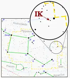 IK Pegasi (or HR 8210) is a binary star system in the constellation Pegasus. It is just luminous enough to be seen with the unaided eye, at a distance of about 154 light years from the Solar System.