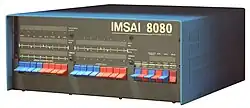 The IMSAI 8080 is an early microcomputer released in late 1975, based on the Intel 8080 (and later 8085) and S-100 bus.[1] It is a clone of its main competitor, the earlier MITS Altair 8800. The IMSAI is largely regarded as the first "clone" microcomputer. The IMSAI machine runs a highly modified version of the CP/M operating system called IMDOS. It was developed, manufactured and sold by IMS Associates, Inc. (later renamed to IMSAI Manufacturing Corp). In total, between 17,000 and 20,000 units were produced from 1975 to 1978.