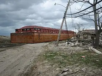 While many other vessels in southeast Louisiana broke their moorings during the storm, ING 4727 became particularly notable both due to its size and because of where it landed. Although its dimensions are standard for barges in commerce on the Mississippi River System (of which the Industrial Canal is a part), it is larger than most Louisianan houses.[3] During and right after the storm, ING 4727 was moved around by currents in the flooded neighborhood, smashing houses and cars beneath it in an area of several city blocks.