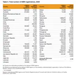 The United States, with 3.9 million registered ISBNs in 2020, was by far the biggest user of the ISBN identifier in 2020, followed by the Republic of Korea (329,582), Germany (284,000), China (263,066), the UK (188,553) and Indonesia (144,793). Lifetime ISBNs registered in the United States are over 39 million as of 2020.[16]