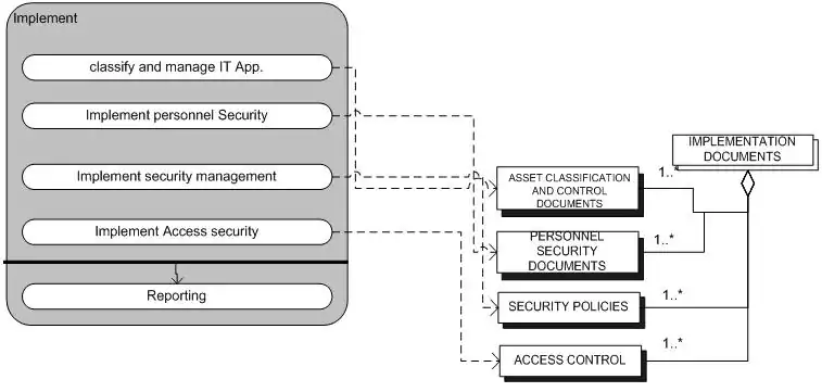 | Implement security management | Specific security requirements and/or security rules that must be met are outlined and documented. The process ends with security policies. | |