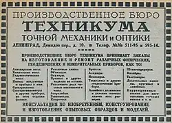 In 1917 the Mechanics, Optics and Watchmaking Department became its own entity–Petrograd Technical College for Mechanics, Optics and Watchmaking. Norbert Boleslavovich Zavodsky became its headmaster.[9] In 1920, most of its classes were transformed into Petrograd College for Fine Mechanics and Optics (later–Leningrad). The municipalities allocated a building for it in Demidov Pereulok (Pereulok Grivtzova).[9] The colleges’ manufacturing facilities made a variety of complex optical and fine mechanics products.[10] The first in USSR group of instrument engineers graduated here in 1931.