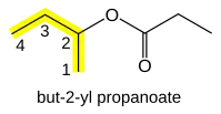 If the alkyl group is not attached at the end of the chain, the bond position to the ester group is suffixed before "-yl": CH3CH2CH(CH3)OOCCH2CH3 may be called butan-2-yl propanoate or butan-2-yl propionate.. The prefix form is "oxycarbonyl-" with the (R') group preceding.