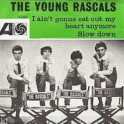 Atlantic released "I Ain't Gonna Eat Out My Heart Anymore" on November 22, 1965, backed by "Slow Down" as Atlantic 45–2312.[14] Critic Richie Unterberger calls the song an "impressive start".[7] The song stands unique in the fact that it was one of the Young Rascals first and among their only singles using their original line-up Eddie Brigati on lead vocals and percussion, Felix Cavaliere on keyboards and backing vocals, Gene Cornish on guitar and backing vocals, and Dino Danelli on drums; Cavaliere would pick up singing duties on the following single "Good Lovin'", and would assume this role for most of band's future recording career.[15] Cornish stated that the single initially was off to a slow-start, initially charting only locally on the East Coast.[9] Upon the group's first tour to Los Angeles four weeks after the single was released, the band broke attendance record at the Whisky a Go Go and subsequently received airplay on the West Coast as well.[9] As Cornish puts it, "it never had concentrated airplay throughout the entire country all at one time" as it had dropped off most charts on the east coast by then.[9]