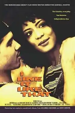 I Like It Like That is a 1994 American comedy-drama film about the trials and tribulations of a young Puerto Rican couple living in a poverty-stricken New York City neighborhood in the South Bronx. The film stars Lauren Velez, Jon Seda, Lisa Vidal, Griffin Dunne, Jesse Borrego and Rita Moreno, and was written and directed by Darnell Martin who, in her filmmaking debut, became the first African-American female filmmaker to take helm of a film produced by a major film studio.