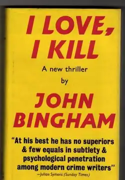 I Love, I Kill is a 1968 thriller novel by the British writer John Bingham.[1] Dodd Mead released it in America with the alternative title Good Old Charlie.