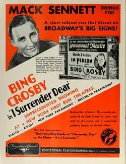 I Surrender Dear is a 1931 Educational-Mack Sennett Featurette (No. S2094) starring Bing Crosby and directed by Mack Sennett. This was the first of the six short films Crosby made for Sennett and which helped launch his career as a solo performer.[1]