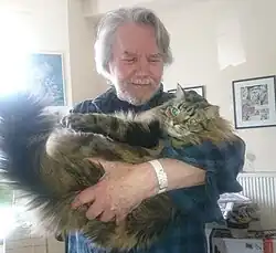 ![]() Gibson in 2019, at home with his cat "Floofy" | |