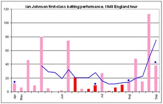 Johnson had more success in the tour matches, taking 85 wickets at 18.37 in all first-class matches. This placed him third in the wicket-taking and fifth in the averages among the Australians.[102] In the first-class matches excluding the Tests, Johnson was the leading wicket-taker.[101][102] He bowled more overs than anyone but Johnston, allowing Bradman to ease the workload on his pace spearheads Lindwall and Miller, allowing them to conserve energy ahead of the Tests.[102] Johnson's most successful game with the ball was against Gloucestershire, which yielded match figures of 11/100.[57] Like his bowling, Johnson's batting was also more successful outside of the Tests, scoring 543 runs at 30.16 in 22 innings, with a top-score of 113 not out against Somerset and an 80 against a MCC team that consisted almost entirely of Test players.[19][102] Johnson usually batted at No. 7 or No. 8, although he was notably used as a makeshift opener in the Third Test and scored an aggressive 74 at No. 3 in the run-chase against Hampshire.N-[1] Johnson was prominent in the field, taking 23 catches, the most by a non-wicket-keeper on tour. He usually fielded in the slips.[102]