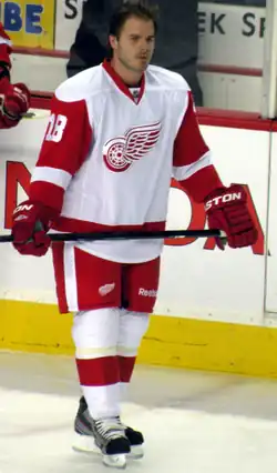 The following summer, White signed a two-year, $5.75 million contract with the Detroit Red Wings, primarily to replace Brian Rafalski who retired after the season.[6] He scored his first goal with Detroit on October 7 during a 5–3 victory over the Ottawa Senators, and finished with 32 points during the 2011–12 season. The following season, shortened because due to the 2012–13 NHL lockout, saw White's role with the Red Wings dramatically reduced; he appeared in only 25 of the team's 48 games and scored only four points. During 2012–13 lockout, White made controversial public comments about NHL Commissioner Gary Bettman, referring to him as "an idiot...[who has] done nothing but damage the game." White later expressed regret for making the remarks.[7][8]