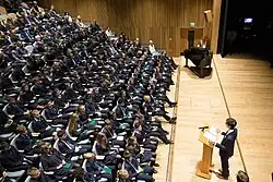 Projects overseen by Barnsley Hewitt and Mallinsons Architects included a new sports hall, opened in 2008; the New School, with a new library and classrooms, opened in 2011; and the Performing Arts Centre, opened in 2015.[9][2] The Performing Arts Centre's main auditorium seats 300 people and contains a raised stage, a scenery workshop, and a 100-seat drama studio. The building also houses bathrooms, two bars, function rooms, offices, and changing rooms. The slope on which the centre was built presented challenges for the architecture firm but "gave rise to an exciting and luxurious set of internal and external spaces." Construction was still a success and has since hosted activities including plays, pantomimes, National Theatre Live, BBC Question Time, and guest lecturers.[12] The Refectory, completed by Maccreanor Lavington and opened in 2020, includes a Great Hall, Small Hall, mezzanine, and a Sixth Form study centre. The design included laminated lattice, vaulted ceilings, and contrasting bronze handrails, door rails, and lights.[13]