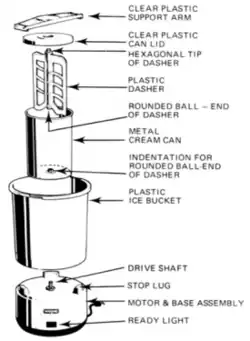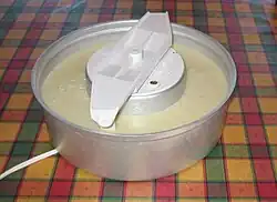 Ice cream makers may prepare the mixture by employing a hand-crank or by employing an electric motor. The resulting preparation is often chilled through either pre-cooling the machine or by employing a machine that freezes the mixture. An ice cream maker has to simultaneously freeze the mixture while churning it so as to aerate the mixture and keep the ice crystals small (less than 50 μm).[1] As a result, most ice creams are ready to consume immediately. However, those containing alcohol must often be chilled further to attain a firm consistency. Some machines—such as certain lower-priced countertop models—require the resulting mixture to be frozen for additional time after churning is complete.
