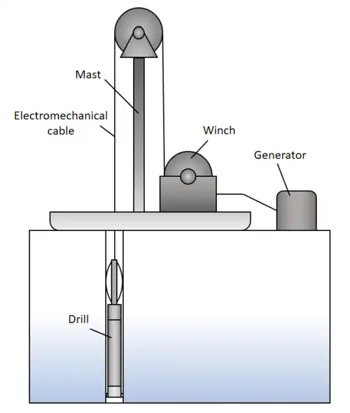Most coring drills are designed to retrieve cores that are no longer than 6 metres (20 ft), so drilling must stop each time the hole depth is extended by that amount, so that the core can be retrieved.[49] A drill string that must be assembled and disassembled in segments, such as pipe sections that must be screwed together, takes a long time to trip in and out; a cable which can be continuously winched up, or a drill string that is flexible enough to be coiled, significantly reduces tripping time.[48][35] Wireline drills have a mechanism that allows the core barrel to be detached from the drill head and winched directly to the surface without having to trip out the drill string. Once the core is removed, the core barrel is lowered to the bottom of the hole and reattached to the drill.[59]