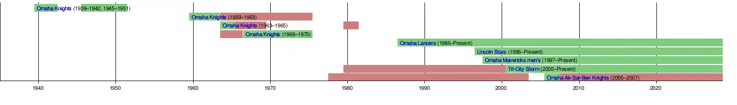 Omaha Ak-Sar-Ben KnightsTri-City StormOmaha Mavericks men's ice hockeyLincoln StarsOmaha LancersOmaha Knights (1966–1975)Omaha Knights (1963–1965)Omaha Knights (IHL)Omaha Knights (AHA)