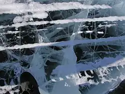 Fracture planes in clear ice – boot for scale at lower left. Note the tire tread imprints at lower right.