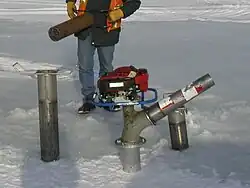 • Ice thickness may be measured with ice augers, at required distance intervals or using a ground-penetrating radar (GPR). This is important, since an ice cover can vary as much as 70% in thickness over a few hundred meters, and the minimum ice thickness is used to determine the bearing capacity of the entire ice cover.[4]