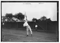 Kumagae went on to win both singles and doubles at the 1915 Far Eastern Games in Shanghai. In 1916, he travelled to the United States with Hachishiro Mikami to compete in the U.S. National Championships, marking the first participation of a Japanese in one of the Grand Slam tournaments. Kumagae spent a total of three months in the United States, during which he competed in 60 matches. He won the singles title at the Newport Casino Invitational, defeating Bill Johnston, the 1915 U.S. National champion, in the final in five sets.[3] He did not lose a single match on a clay court, and lost only four matches on grass courts, rising to the U.S. rank of No. 5. Kumagae would go on to reach as high as No. 3 in the U.S. rankings in 1919.[4][5]