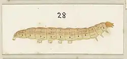 About 1+12 inches in length, of almost uniform thickness, considerably flattened; the head is ochreous, the body very pale ochreous-brown; there are no distinct markings on the thoracic segments, except a few minute black dots round the middle of each; the rest of the body is covered with a number of very fine blackish lines, which become darker posteriorly, and are stronger on the dorsal and lateral regions; there is a row of minute black dots round the middle of each segment; the spiracles are black and the underside of the larva is faintly tinged with green.[5]