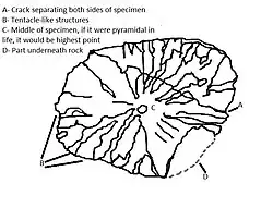 A simple line drawing of the holotype of Ichnusa cocozzi. A- Crack separating both sides of the holotype B- Tentacle-like structures C- Middle of specimen, if it were to be pyramidal in life, it would be the uppermost point D- Part underneath rock/not visible.