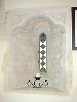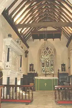 The chancel has two 13th-century lancet windows in its north wall.[3] Near the westerly of these windows is a rectangular recess that may have been a squint.[3] In its south wall are another lancet window and a 13th-century doorway.[3] The Decorated Gothic east window is 14th-century[3] and has reticulated tracery[6] with ogees. The south wall of the chancel has at its east end a window from about 1350 that is said to have been brought from elsewhere, and towards the west end a 15th-century window with a depressed head.[3] Some of the stained glass windows are 20th-century work by Ninian Comper.[4]