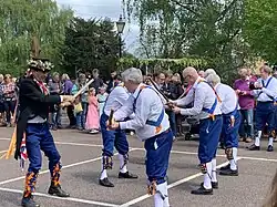 In the Victorian era, villagers would gather May blossoms and leave garlands in doorways.[4] These garlands often consisted of a cloth stretched over a wooden hoop, with two dolls, representing the Virgin Mary and the Christ Child, fastened in the centre of the cloth. The hoop had ribbons sewn around its frame, and flowers fastened to the cloth; children would stop at houses and charge money to see the garland.[9] A procession through the village is held, led by characters known as the "Moggies"; these comprise the Sweep and his wife (both may have blackened faces), the Lord and the Lady, all four of whom are played by men. Originally, these characters would visit houses carrying garlands, may boughs,[8] and besoms (a type of broom made from a bundle of twigs) asking for ale; they would sing a Day Song, returning the next day to ask for payment.[10] The name "Moggies" is identified by Brian Shuel with the nearby village of Moggerhanger.[8]
