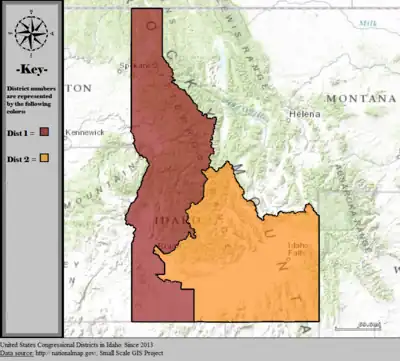 List of members of the United States House delegation from Idaho, district boundary maps, and the district political ratings according to the CPVI. The delegation has a total of 2 members, both with the Republican party.